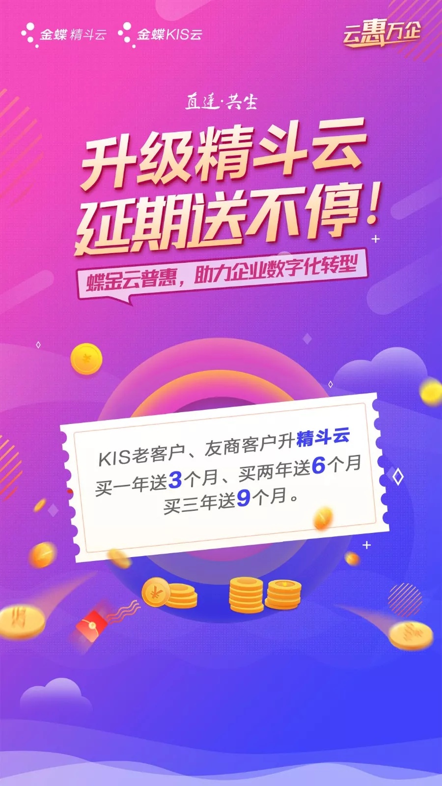 KIS老客戶、友商客戶升級至精斗云,享有買一年送3個月、買兩年送6個月、買三年送9個月的權(quán)益。